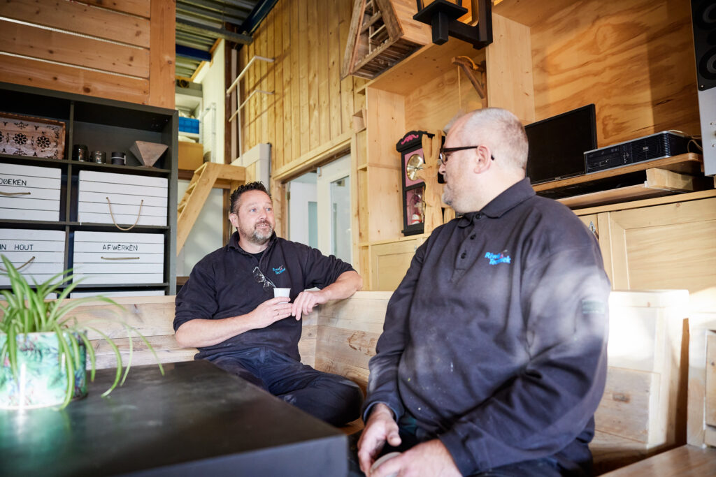 We beginnen ’s ochtends redelijk op tijd om 07:30 uur met een kop koffie of thee. Daarna werkt iedereen aan zijn of haar eigen werk. Of dat nu een gezamenlijke opdracht is of een project waar je alleen mee aan de slag gaat. De sfeer is hier altijd ongedwongen. We accepteren elkaar en geven iedereen de ruimte om zichzelf te zijn en lekker hun eigen ding te doen. Maar we helpen en steunen elkaar ook.