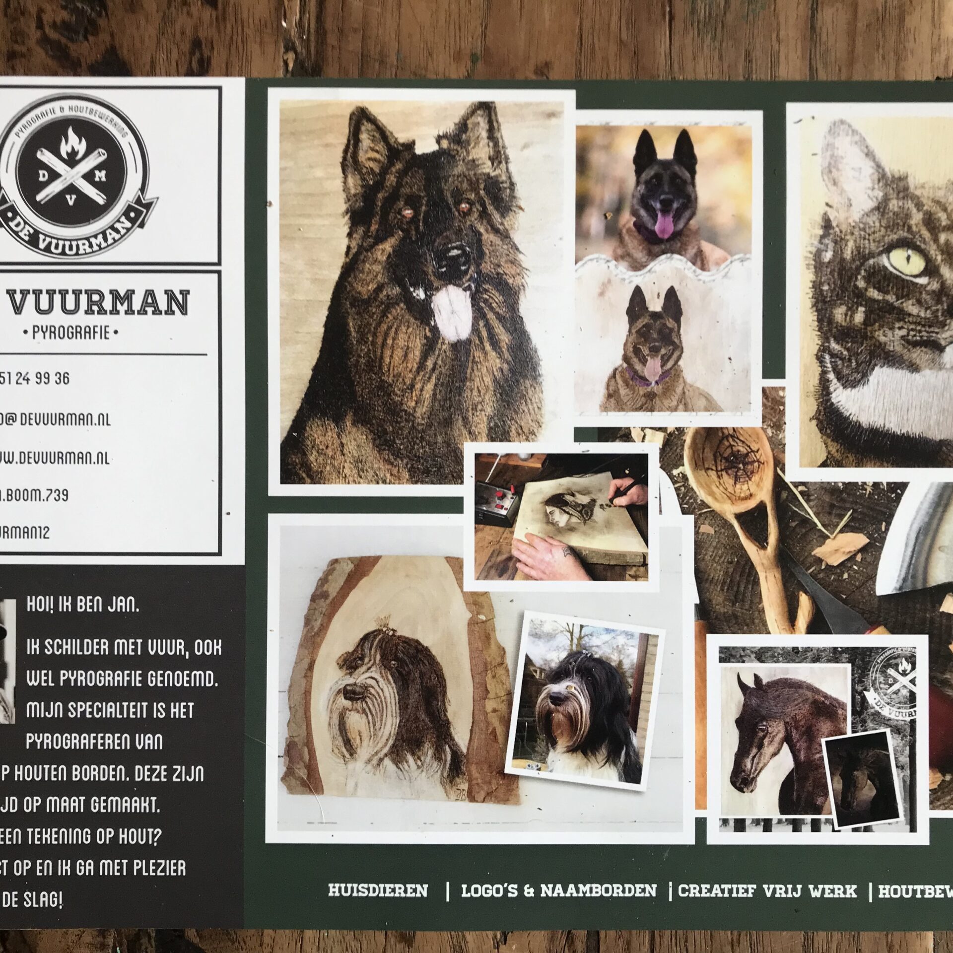 Zijn thuis is een museum van artistieke creaties en oude gebruiksvoorwerpen. Ook is hij een groot dierenliefhebber en heeft hij ze graag om zich heen. Voor je het weet heb je een kat of een knuffel kip op schoot en vertelt Jan over oude lepels in een nieuw jasje. Zijn grootste hobby is Pyrografie. Branden in hout. Of beter gezegd schilderen met vuur.